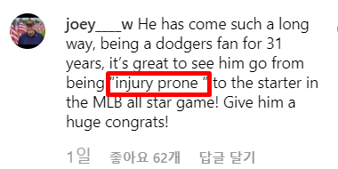 열혈팬님의 코멘트도 있네요. 번역하면, ' 31년간 다저스 팬으로서 말씀드리면, '쉽게 부상당하는 투수'에서 메이저리그 올스타 선발투수로 출전해서 정말 기쁘게 생각한다. 먼길을 온 그에게 큰 축하를 보내주자'입니다.